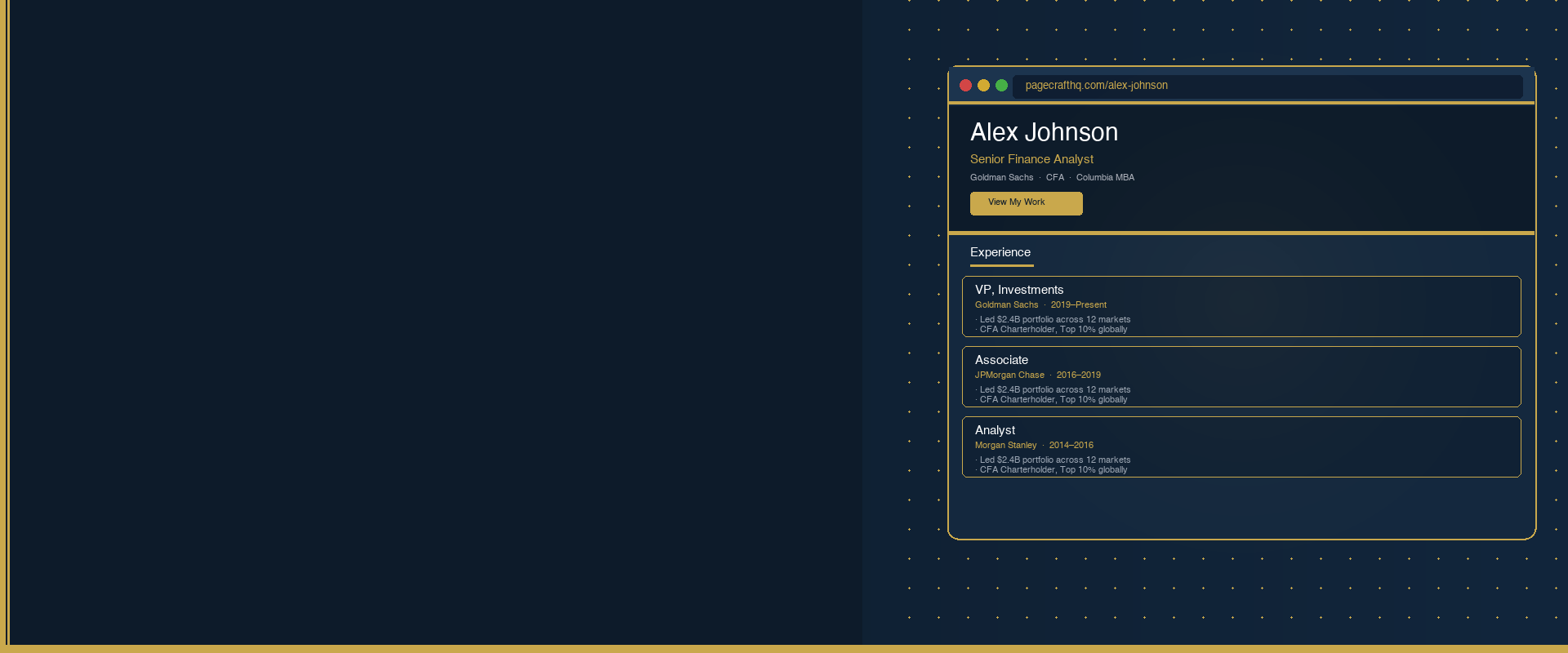 A professional personal website built around your resume, your career, and your industry. Not a profile page, not a template you fill out.